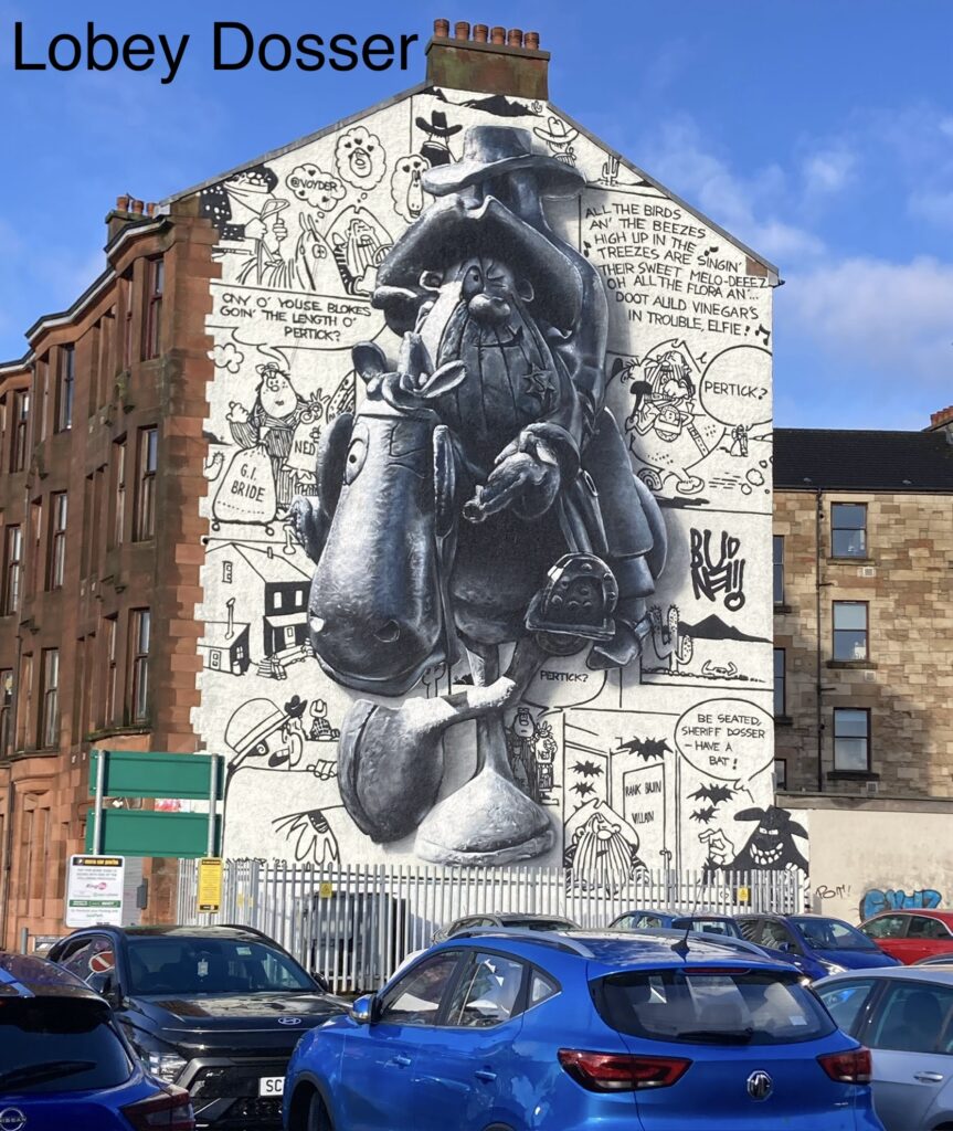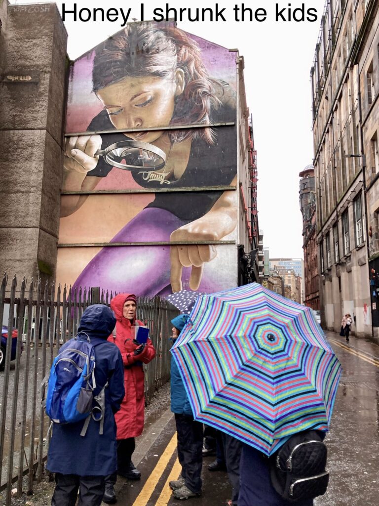 On Saturday after storm Eowyn the leader and 8 others managed to get transport into Central Station. The Mural Walk took us west looking at various murals, crossing the new bridge into Govan and viewing the Margaret Barbour sculpture, lunch at the Transport Museum, onto the longest mural in Glasgow, the Harbour Development and Andy Scott sculpture Arise and ending up in Partick. Everyone was in good spirits despite the sleet and rain, needless to say the sun shone at the end of the walk
